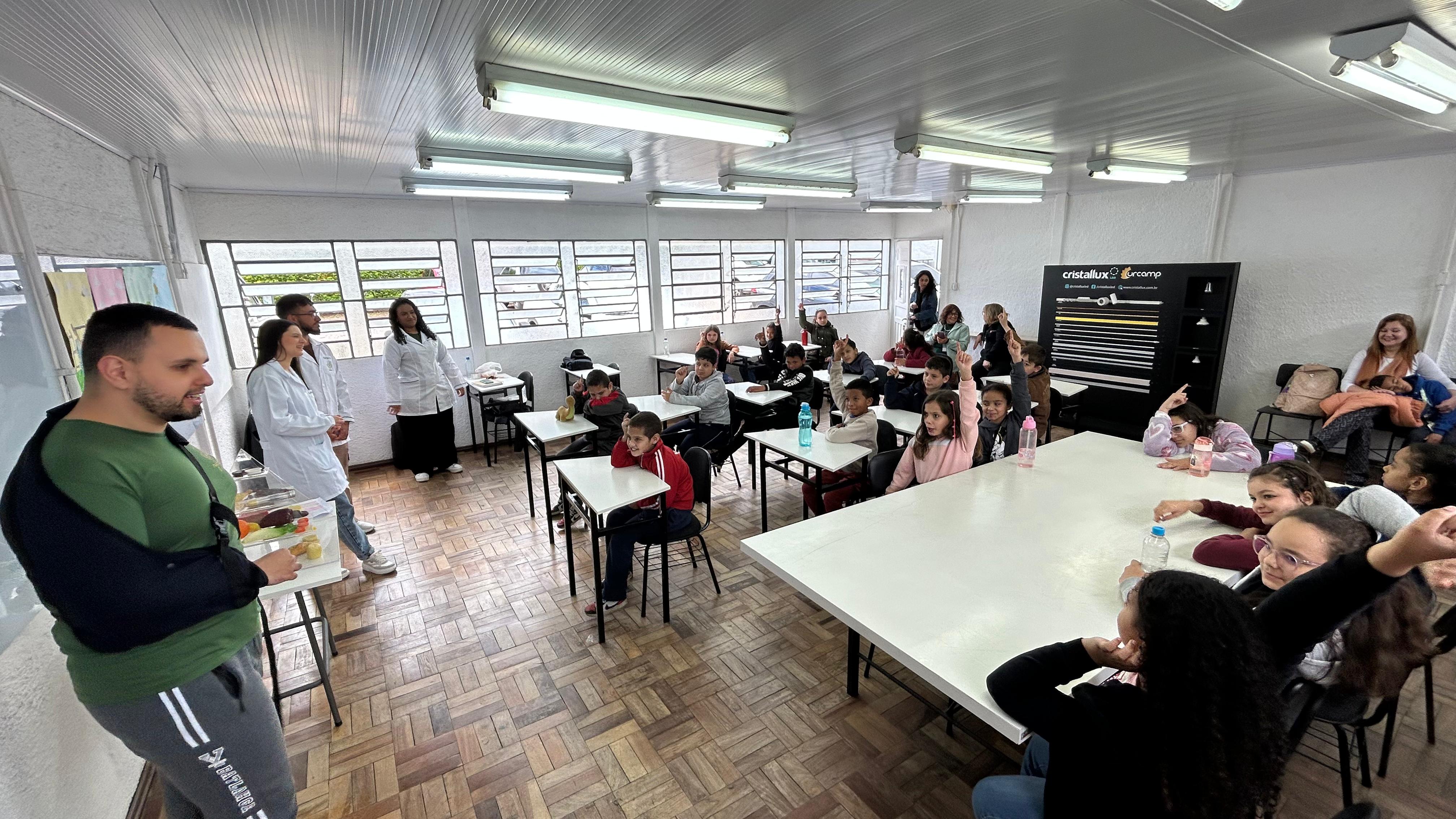 O curso de Nutrição trouxe o “Tour da Alimentação Saudável”. Os pequenos aprenderam sobre a cadeia alimentar, tiraram dúvidas e até levantaram temas como diabetes e hipertensão. O acadêmico do 8º semestre, Diogo Souza, destacou a curiosidade na interação. “Eles mesmos pediram para falar sobre doenças, não estava no roteiro. Isso mostrou a maturidade deles em querer entender assuntos tão importantes”, enfatiza.