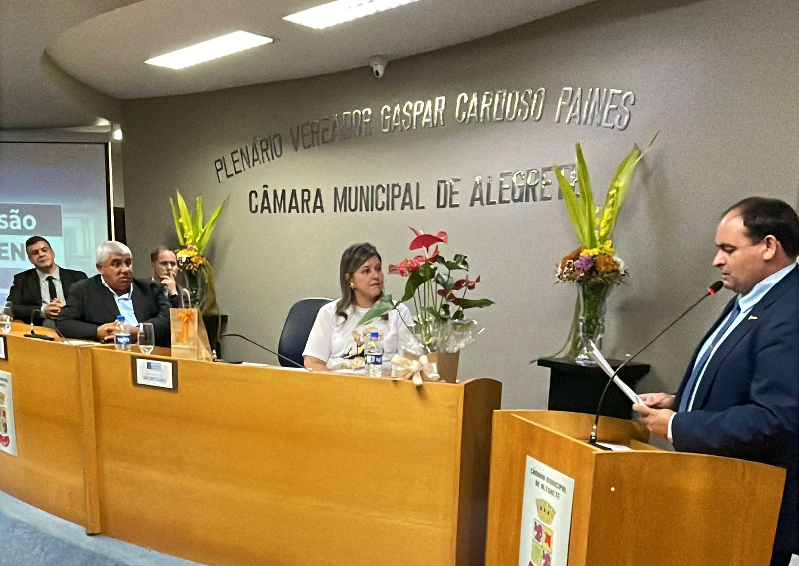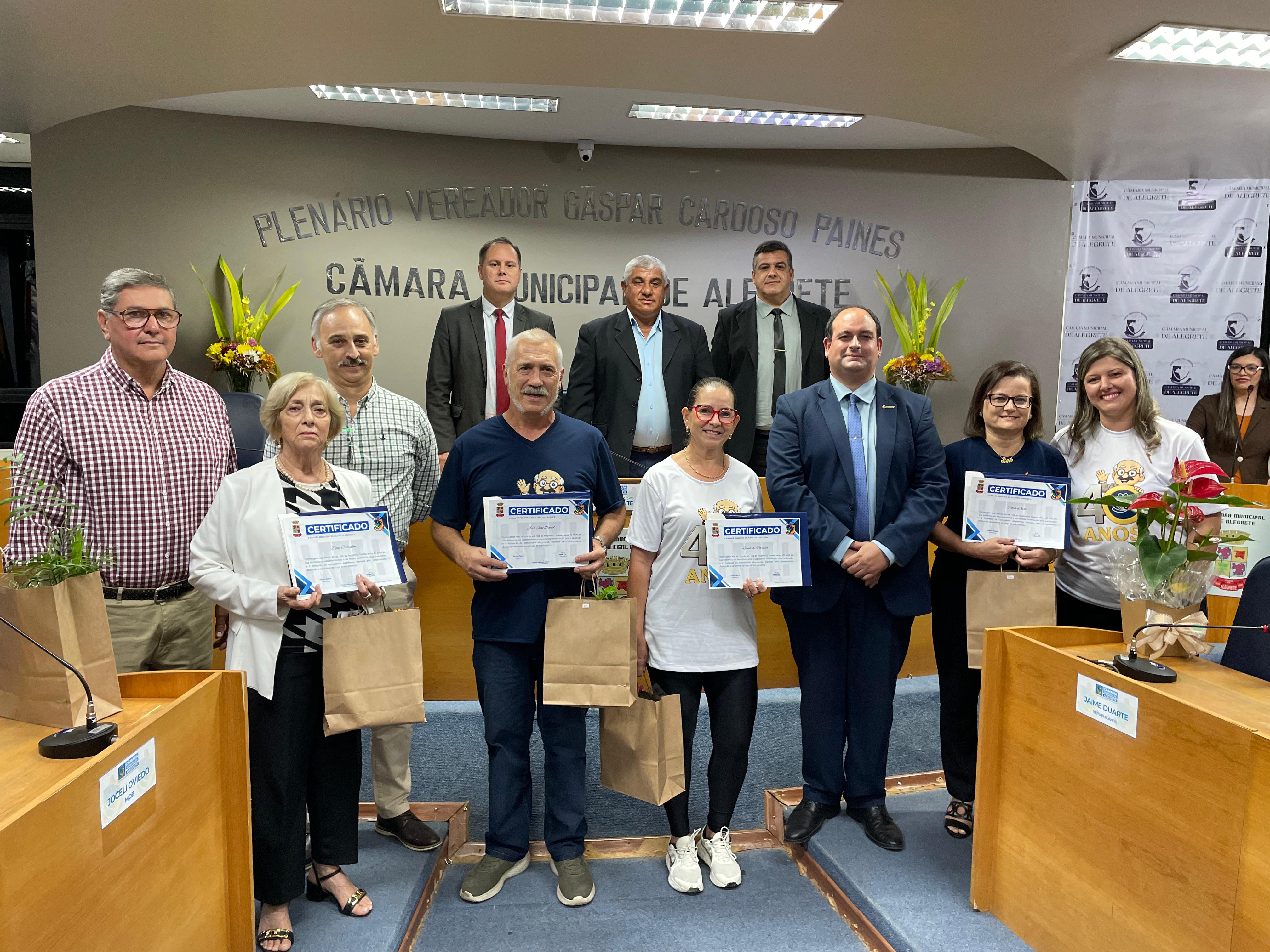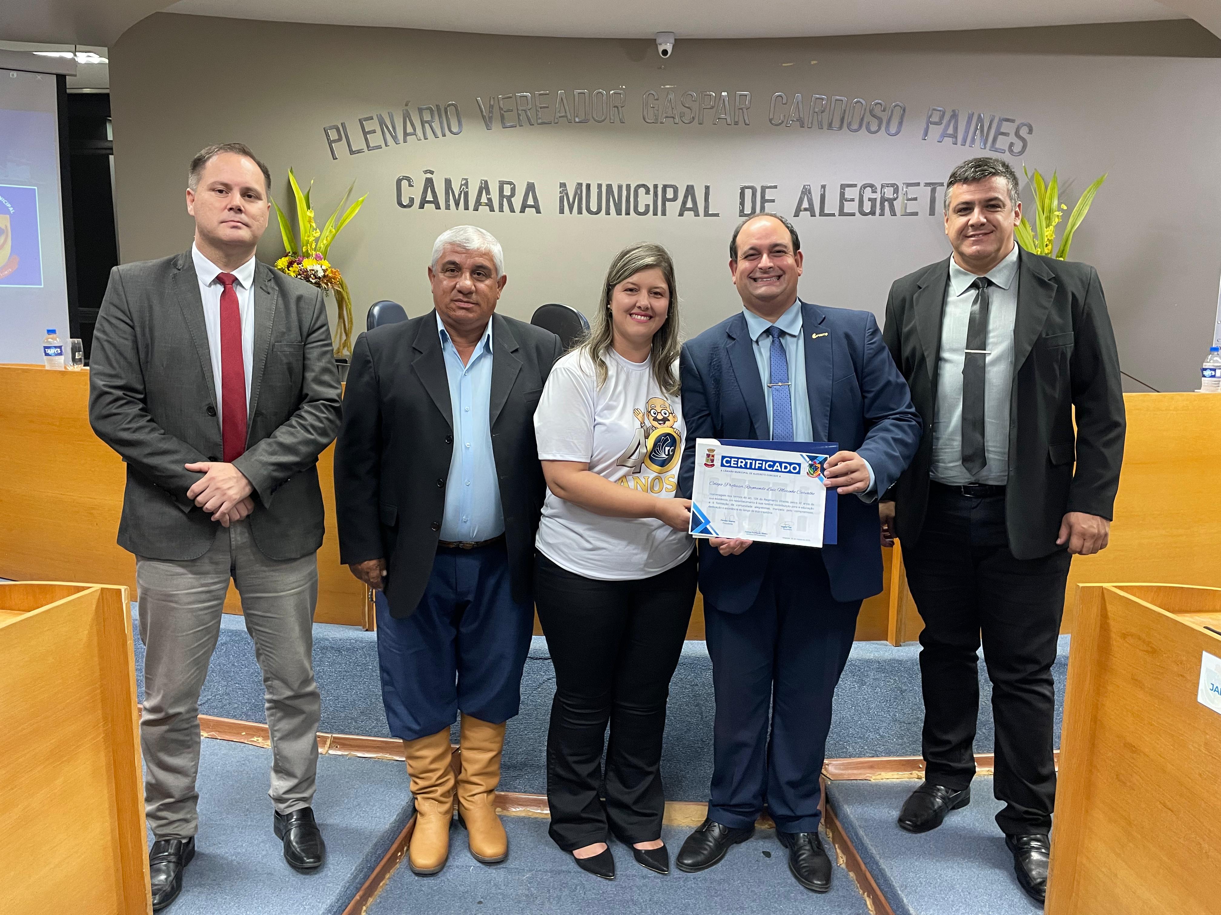 A Câmara Municipal de Alegrete celebrou com uma sessão solene os 40 anos do Colégio da Urcamp Raymundo Carvalho. A cerimônia, realizada na noite da última sexta-feira, 20, contou com a presença do reitor da Urcamp, professor doutor Guilherme Cassão Marques Bragança, da diretora da escola, Giciéli Hohemberger Barúa, da pró-reitora de Ensino, professora doutora Ana Colpo, da coordenadora de colégios da Urcamp, professora mestra Tamyris Ramos, e do coordenador de comunicação e marketing, professor mestre Glauber Pereira.